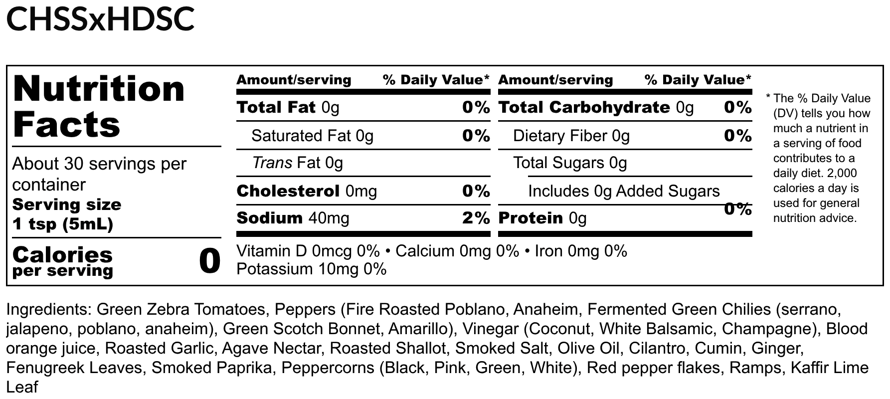 Ingredients: Green Zebra Tomatoes, Fresh Peppers (Fire Roasted Poblano, Anaheim, Green Scotch Bonnet, Amarillo), Vinegar (Coconut, White Balsamic, Champagne), Fermented Green Chilies (serrano, jalapeno, poblano, anaheim) Blood Orange Juice, Roasted Garlic, Agave Nectar, Roasted Shallot, Smoked Salt, Olive Oil, Cilantro, Cumin, Ginger, Fenugreek Leaves, Smoked Paprika, Peppercorns (Black, Pink, Green, White), Red pepper flakes, Ramps, Kaffir Lime Leaf