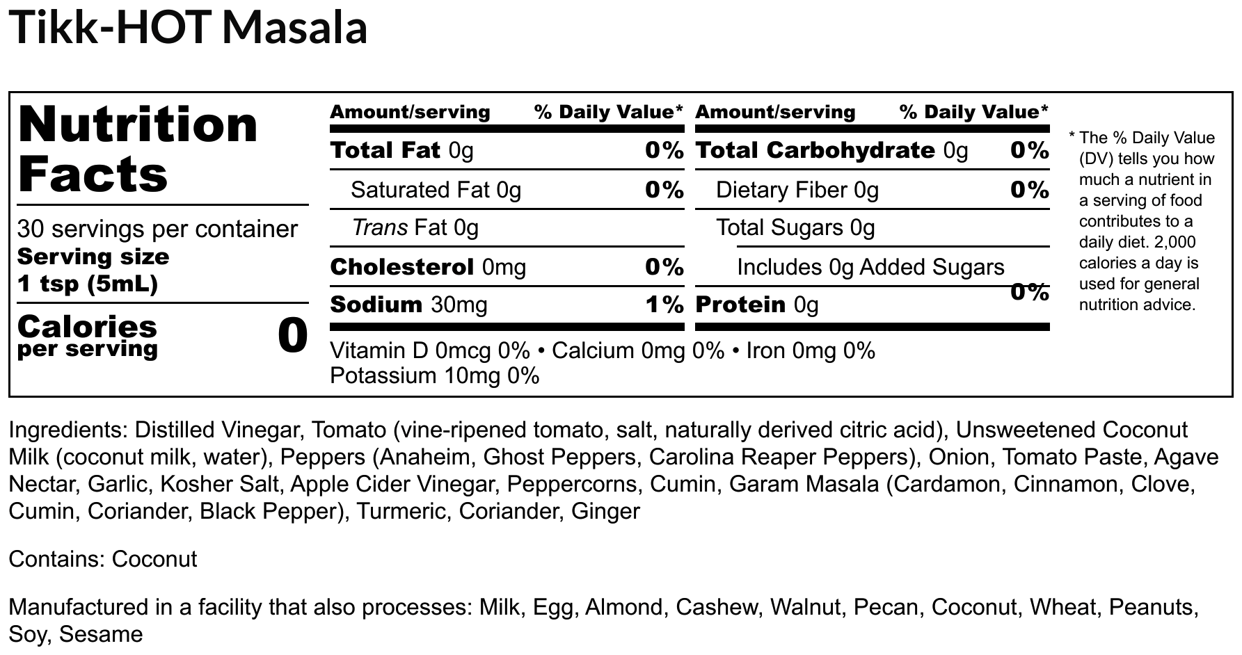 Ingredients: Vinegar, Tomato (Vine-Ripened Tomato, Salt, Naturally Derived Citric Acid), Unsweetened Coconut Milk (Coconut Milk, Water) Peppers (Anaheim, Ghost, Carolina Reaper), Onion, Tomato Paste, Agave Nectar, Garlic, Kosher Salt, Cider Vinegar, Peppercorns, Cumin Seed, Garam Masala (Cardamon, Cinnamon, Clove, Cumin, Pepper & Coriander), Turmeric, Coriander, Ginger