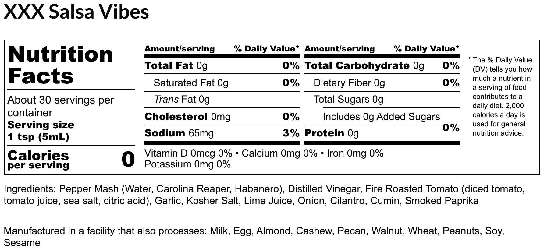 Ingredients: Pepper Mash (Water, Carolina Reaper, Habanero), Distilled Vinegar, Fire Roasted Tomato (diced tomato, tomato juice, sea salt, citric acid), Garlic, Kosher Salt, Lime Juice, Onion, Cilantro, Cumin, Smoked Paprika